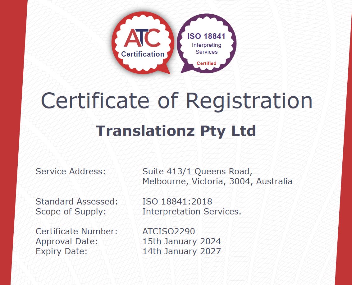 It places a strong emphasis on client satisfaction and engagement by promoting effective communication between Translationz and the interpreters and our clients, leading to superior interpretation experiences. Adhering to ISO 18841 standards elevates interpretation quality, enhancing trust and ensuring exceptional language services for all our clients.