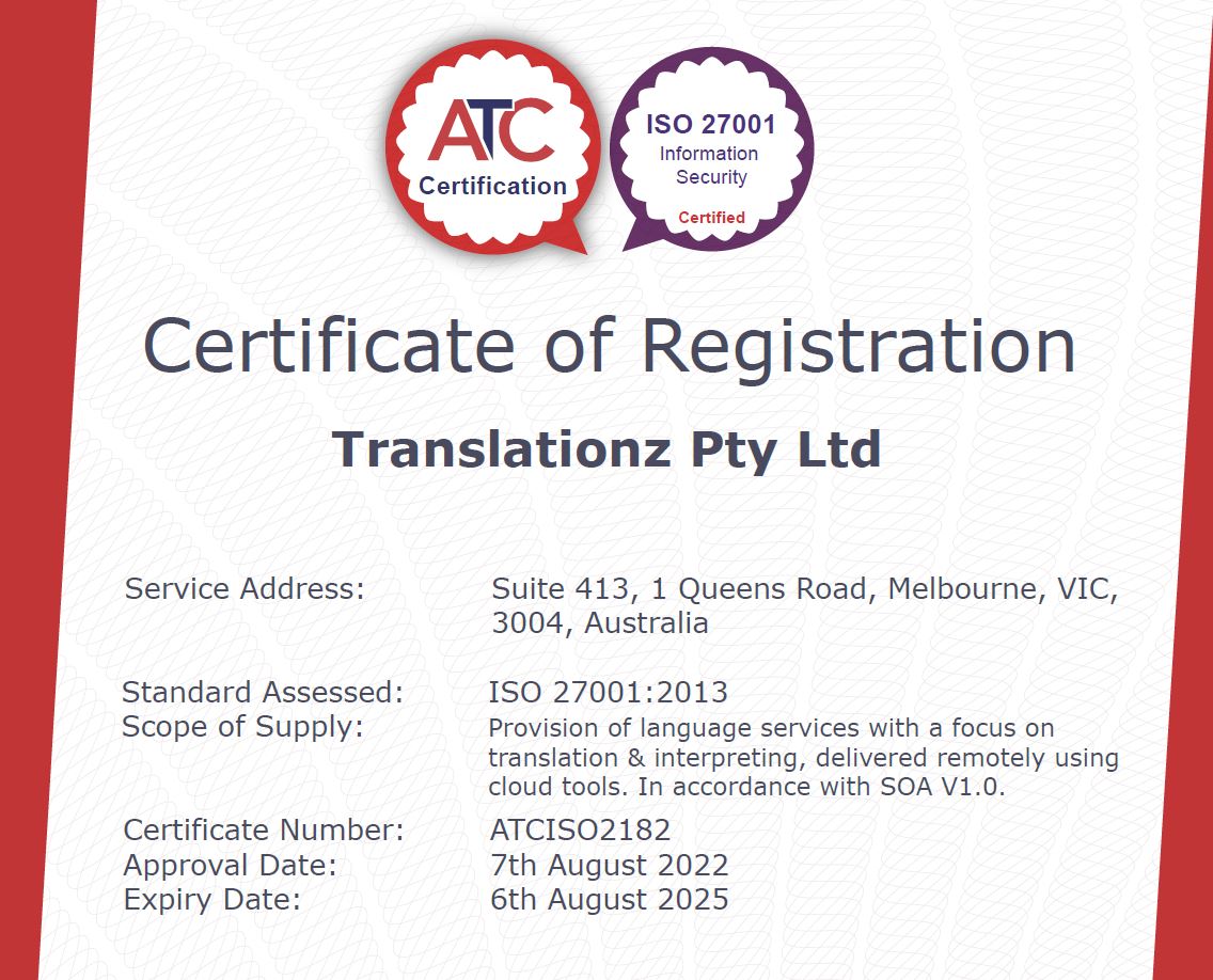 At Translationz, our ISO certifications, ISO 17100, ISO 18841, and ISO 27001,  underscore our commitment to high standards in information security, translation quality, and interpretation.